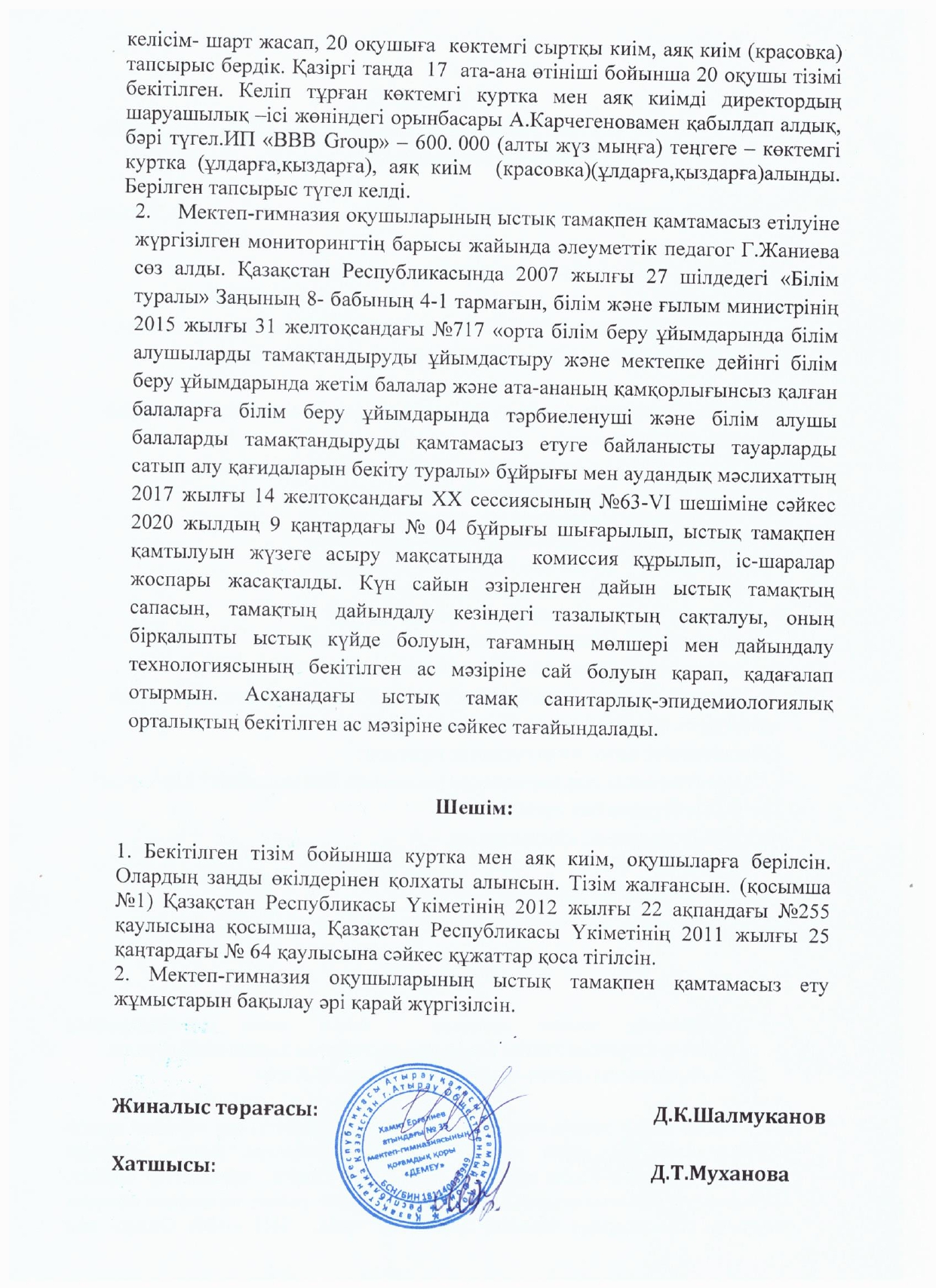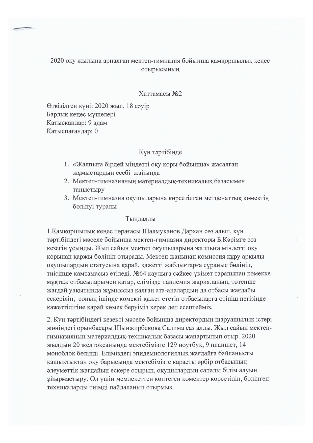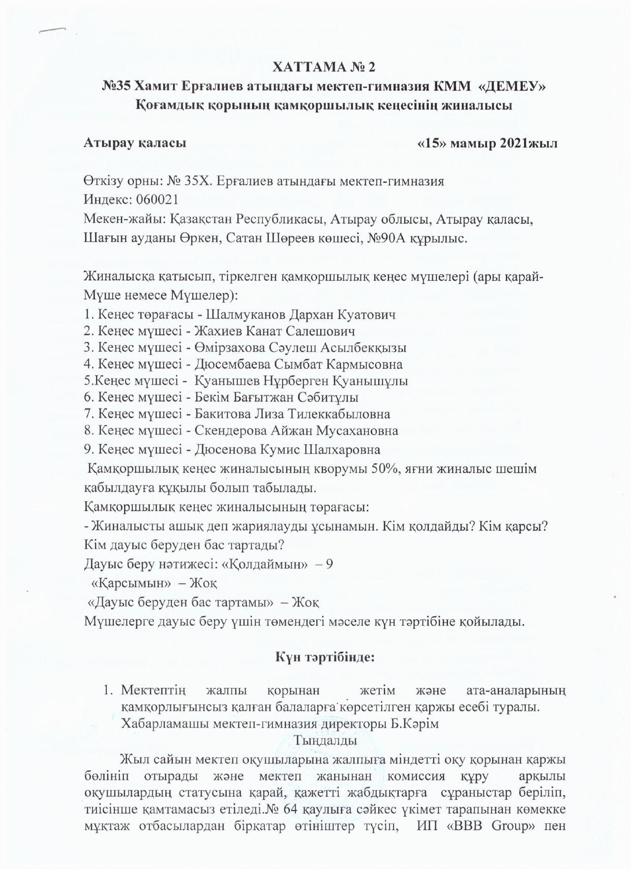 Қамқоршылық кеңесінің №2 отырысының хаттамасы