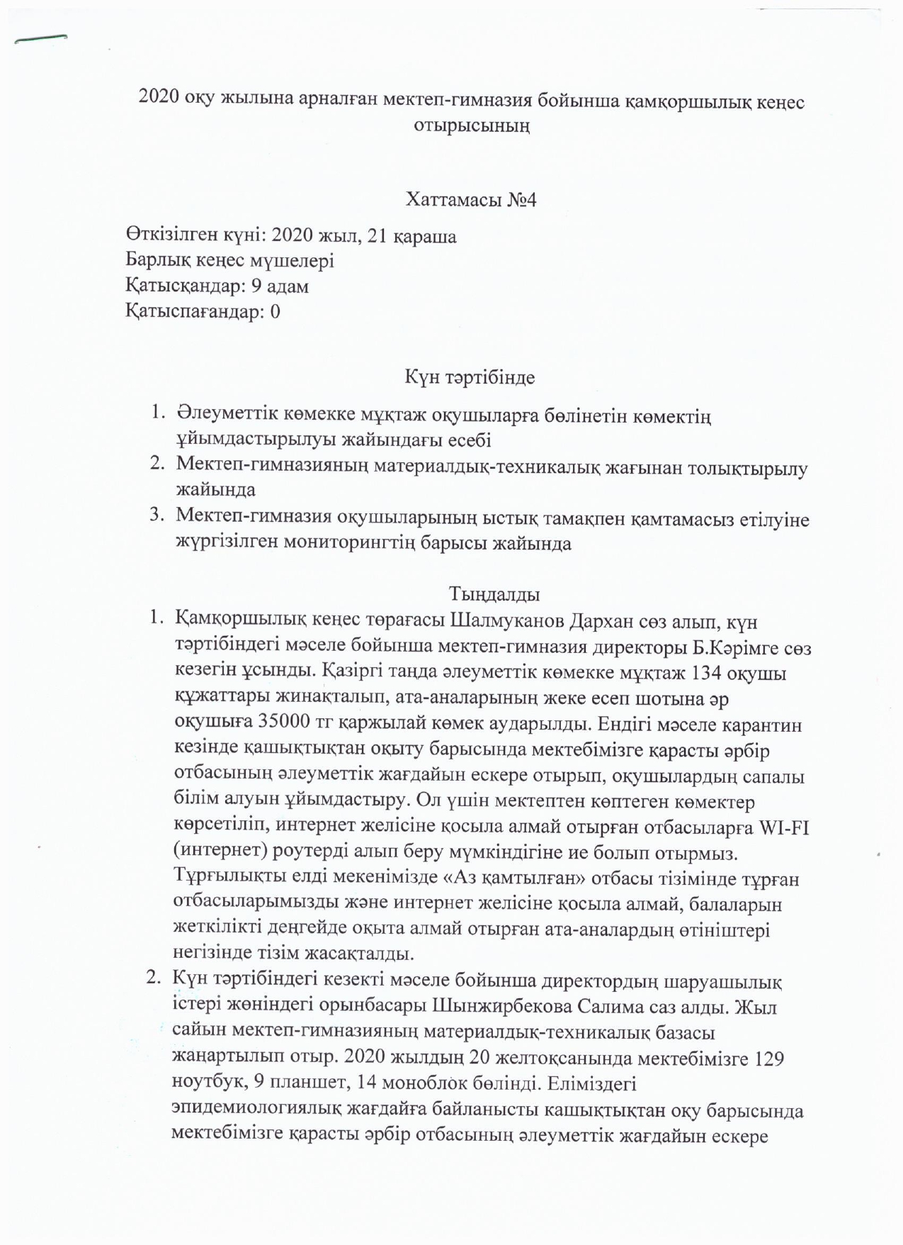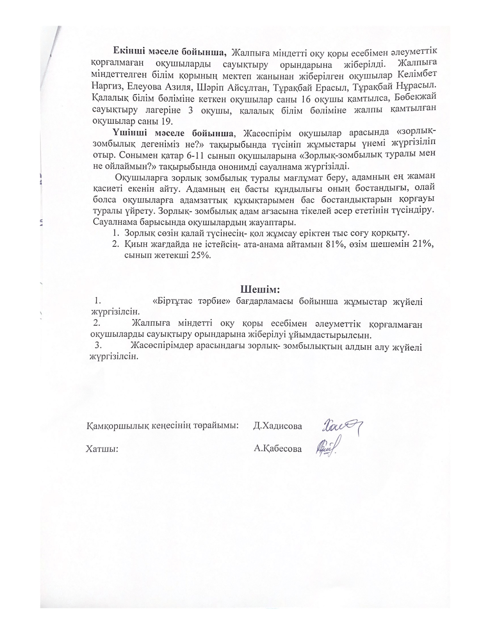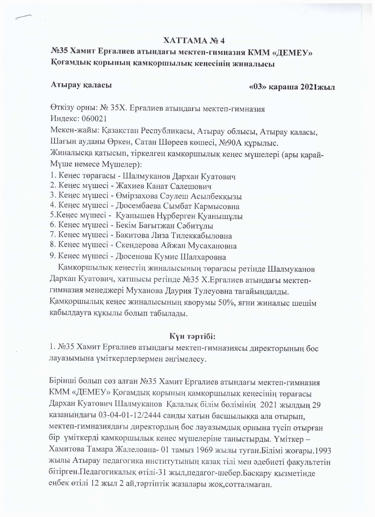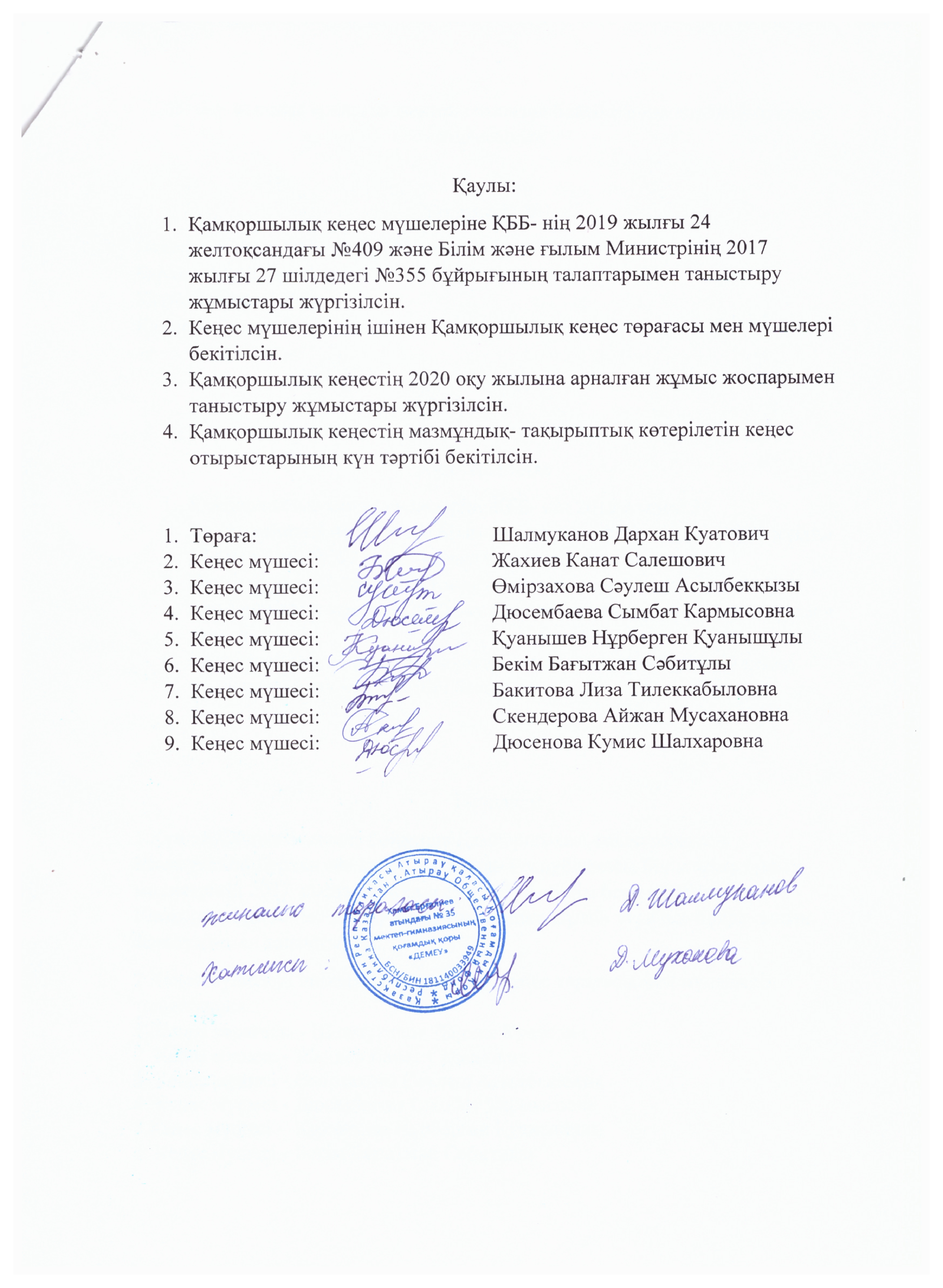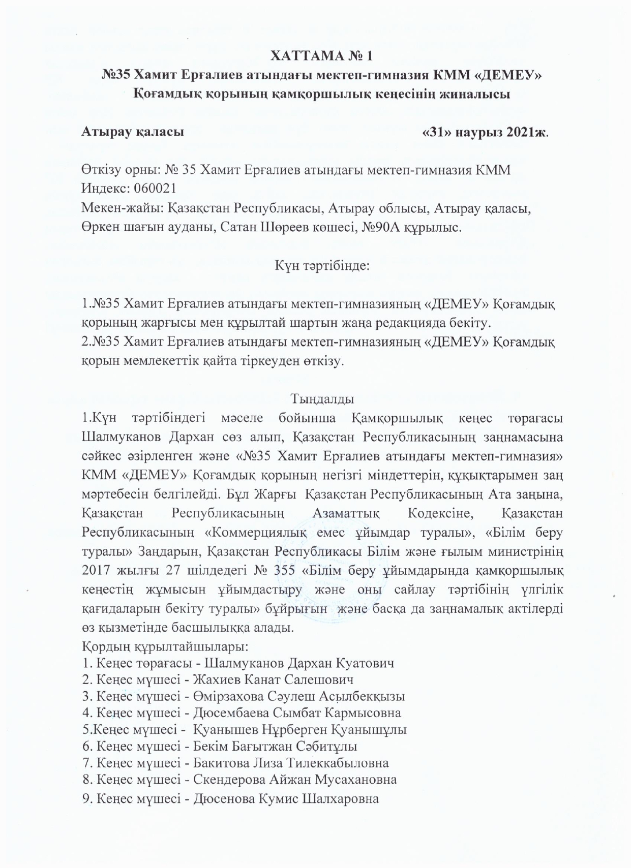 №35 Х.Ерғалиев атындағы мектеп-гимназияда I тоқсан бойынша өткізілген Қамқоршылық кеңестің №1 хаттамасы