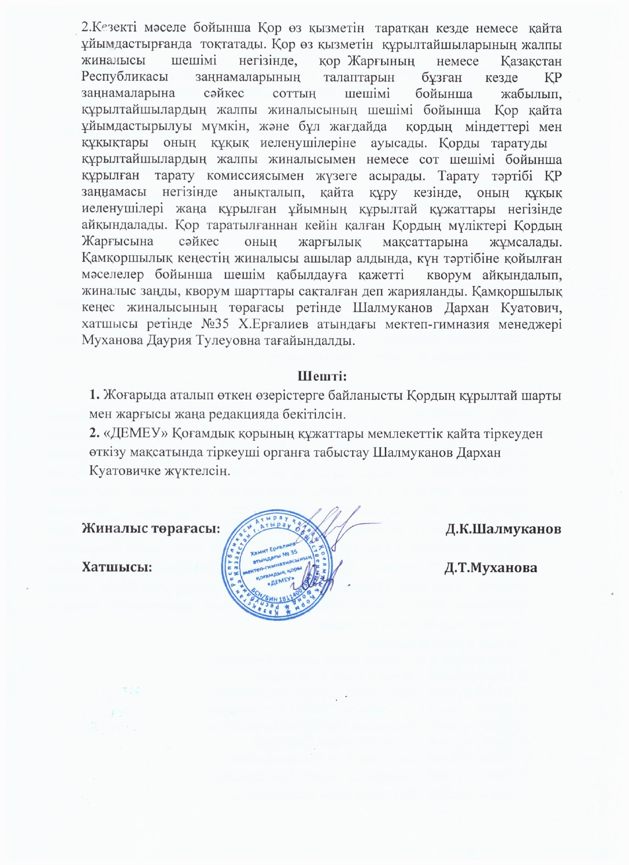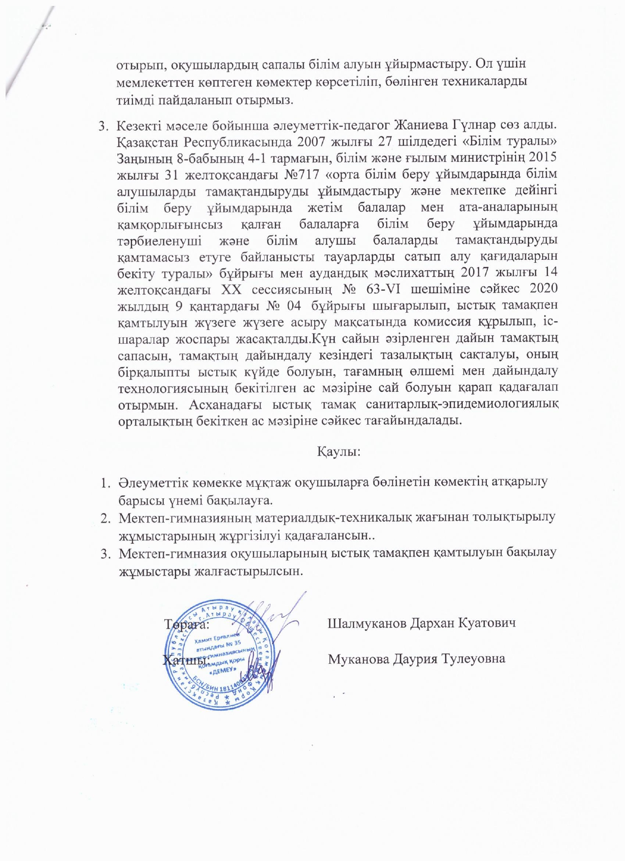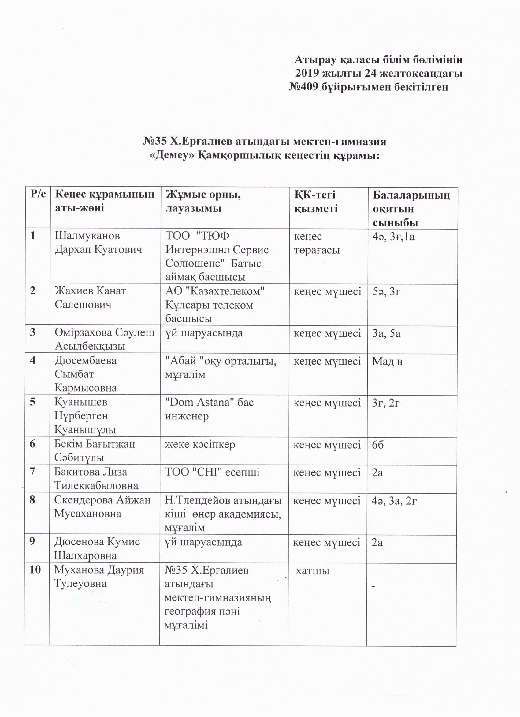 - №35 Хамит Ерғалиев атындағы мектеп-гимназия бойынша «Қамқоршылық Кеңесі» құрылсын.