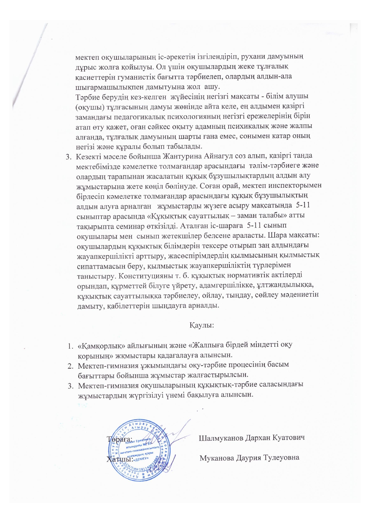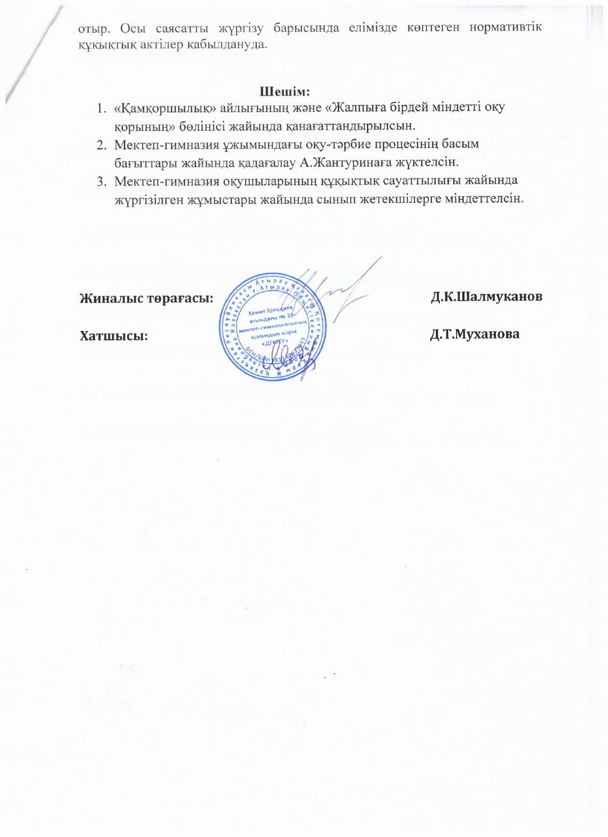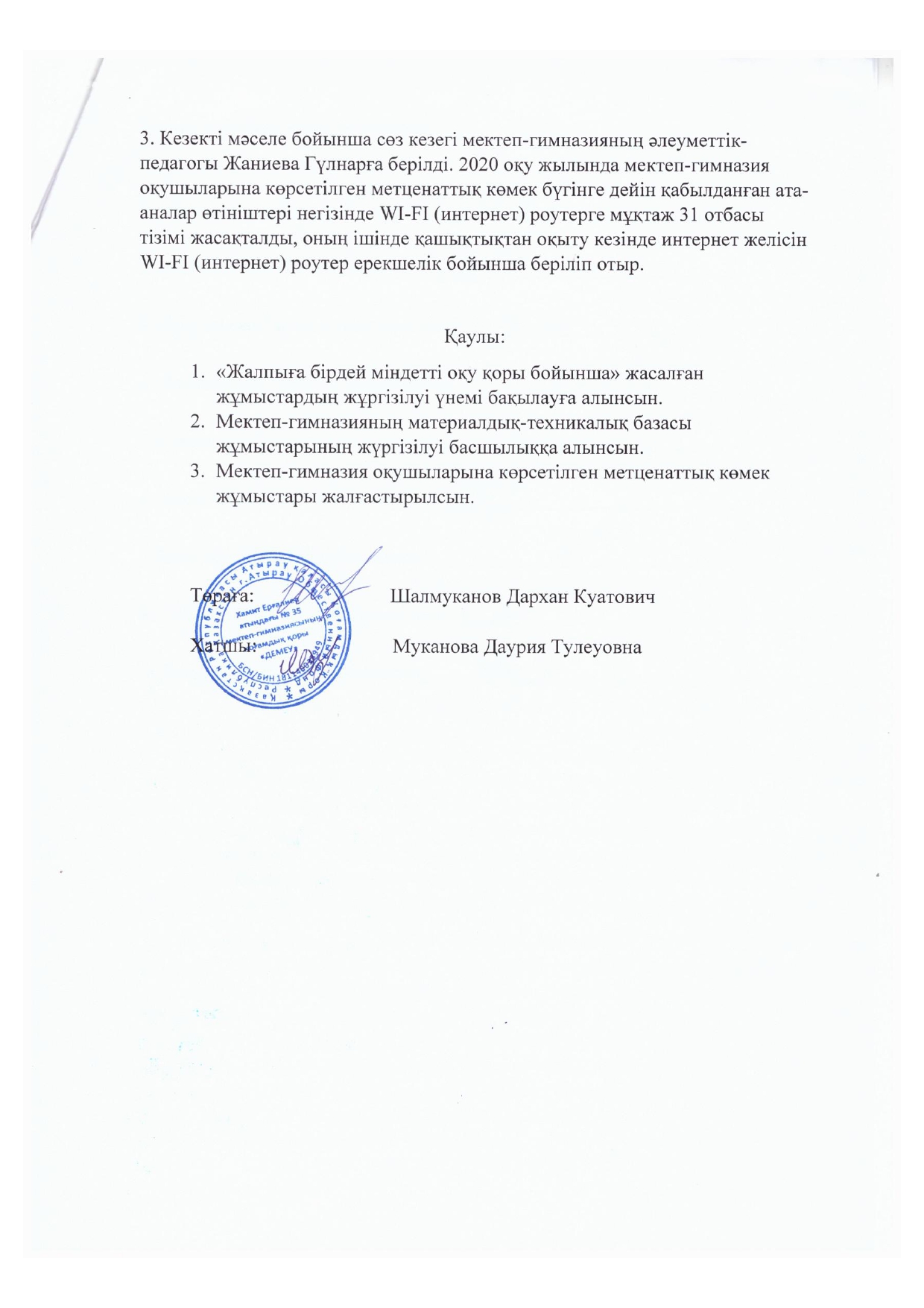 - №35 Хамит Ерғалиев атындағы мектеп-гимназия бойынша «Қамқоршылық Кеңесі» құрылсын.