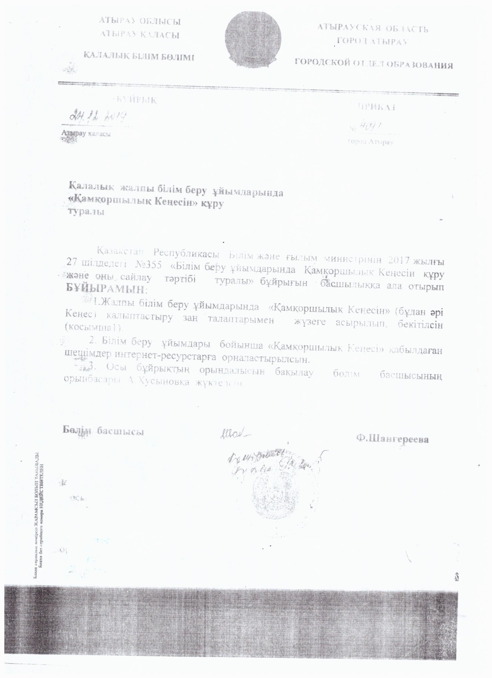 Қалалық білім бөлімінің 2018 жылғы 15 ақпандағы №44 «Білім беру ұйымдарында Қамқоршылық Кеңесін құру және оны сайлау тәртібі туралы» бұйрығын басшылққа ала отырып БҰЙЫРАМЫН: