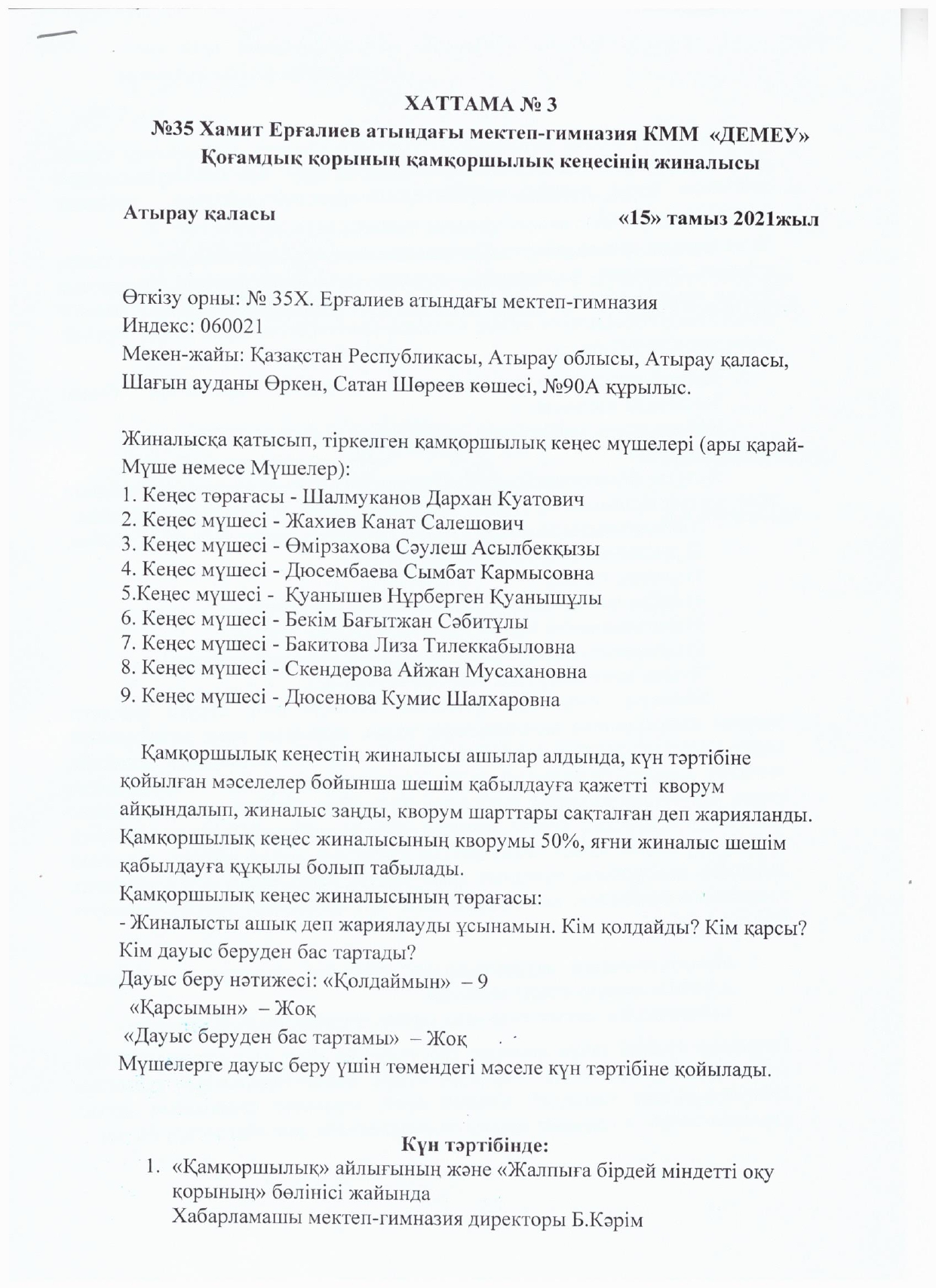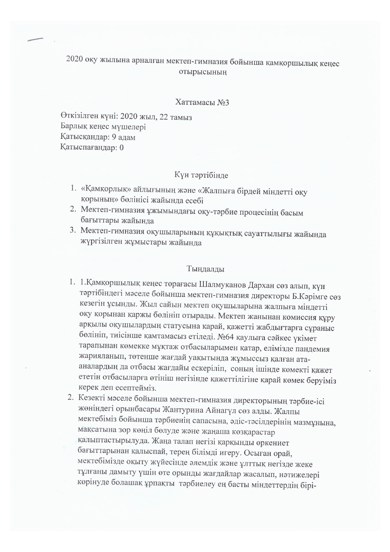 Қамқоршылық кеңесінің №3 отырысының хаттамасы