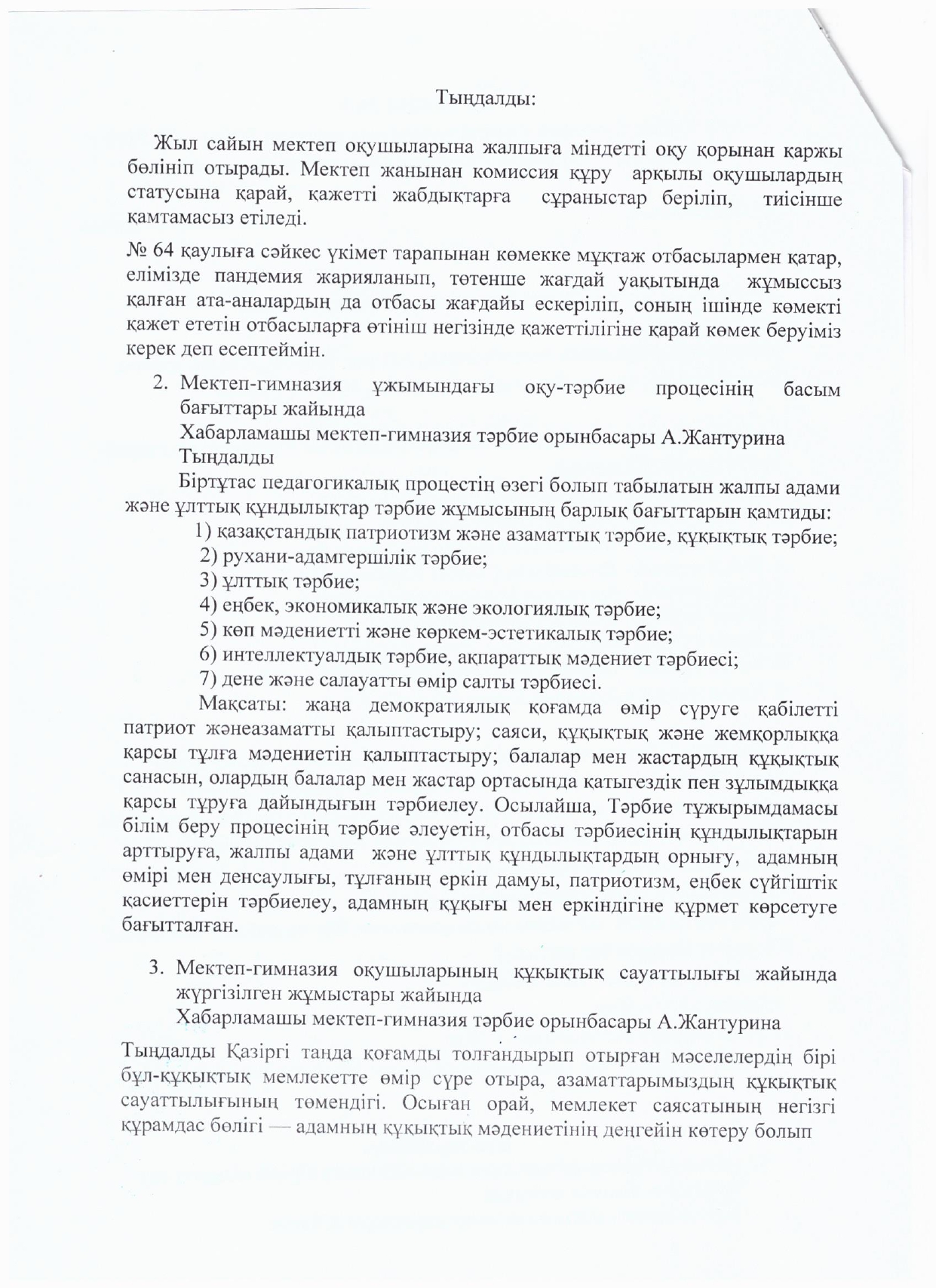 - Қамқоршылық кеңес мүшелігіне директордың тәрбие ісі жөніндегі орынбасарларын енгізілсін.