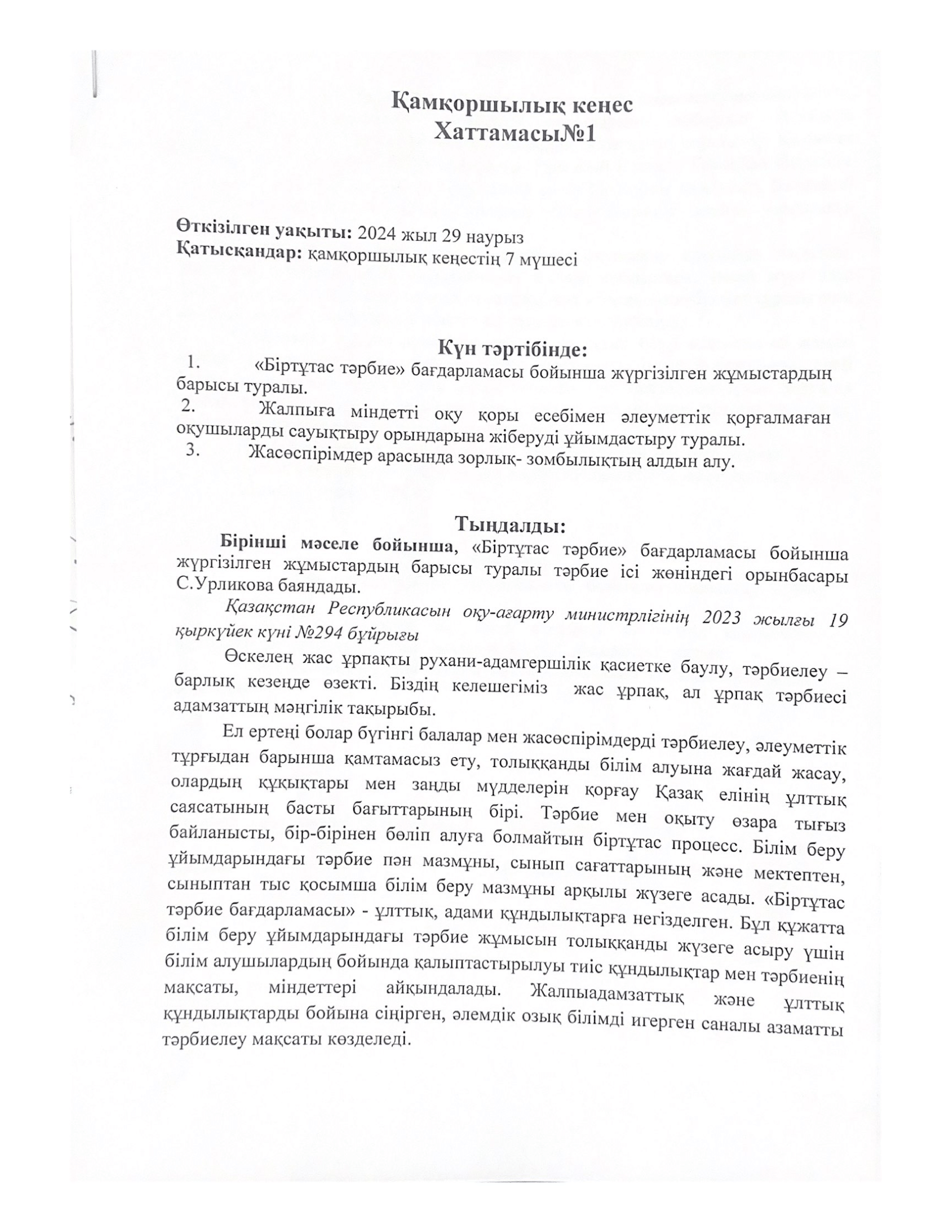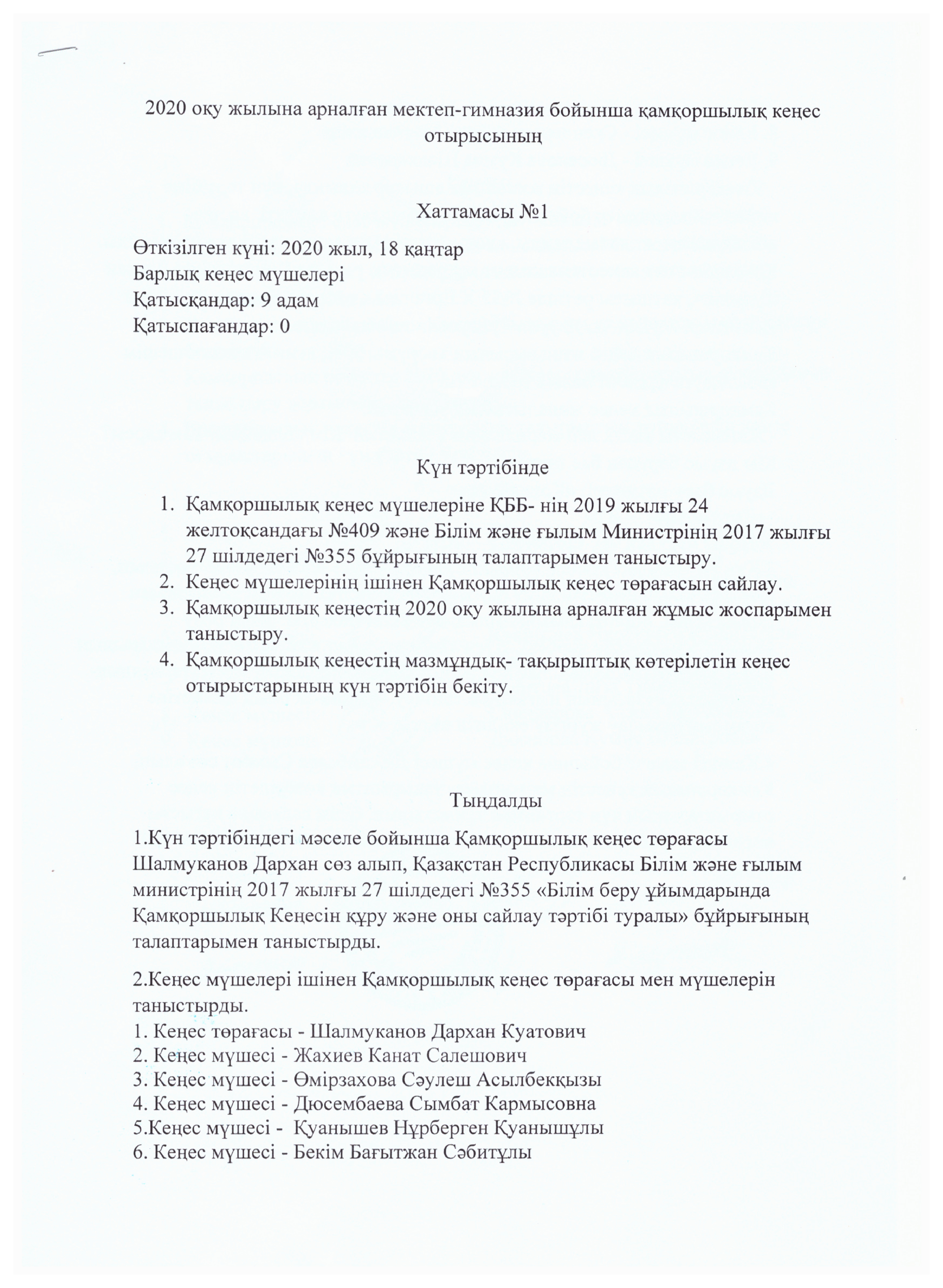 Қамқоршылық кеңес № 1 хаттамасы